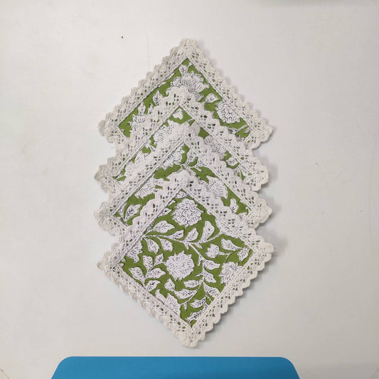 Block printed Coaster Set, custom Coasters with Lace, Gift, Cats, Dining, Crocheted Coasters, Coffee, Tea, Kitchen, Home Decor