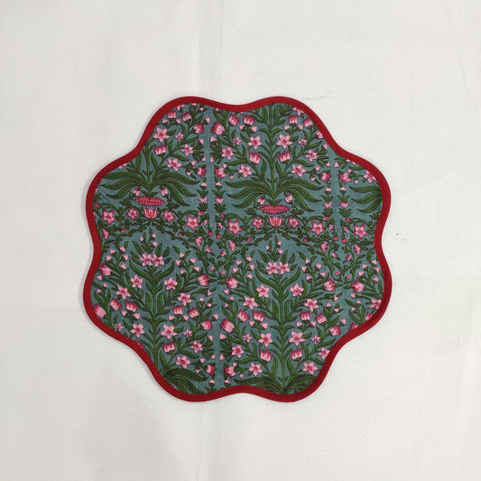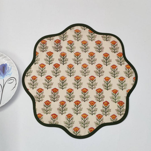 Sage Green Flower Placemat, 'Block Print' fabric table mat easy care, machine washable rustic kitchen decor dining mat set of 2