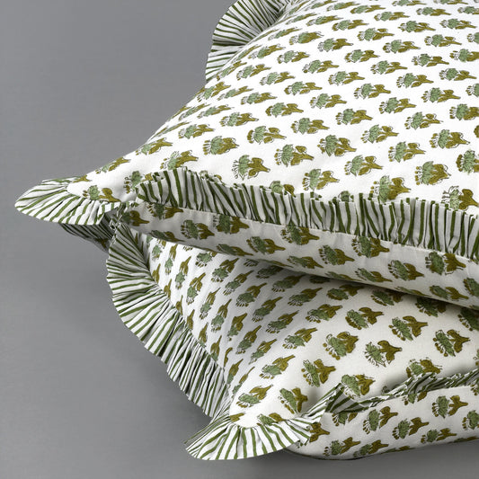 Agate Green Cotton Block Print Ruffle Throw Bed Pillow Covers for Couch, Decorative Couch Pillows for Living Room, Boho Floral Sham