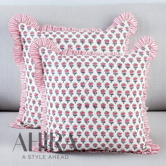 Pink Sapphire Cotton Block Print Ruffle Throw Bed Pillow Covers for Couch, Decorative Couch Pillows for Living Room, Boho Floral Sham