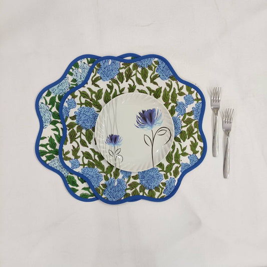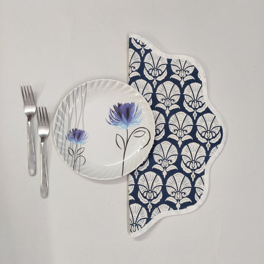 Round scalloped royal blue Flower Placemat, Block Print fabric table mat easy care,machine washable rustic kitchen decor dining mat set of 2