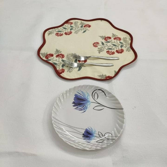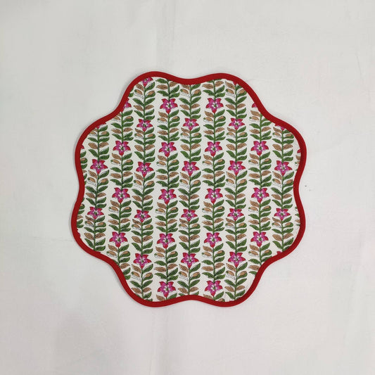 Round scalloped botanical Placemat, Block Print fabric table mat HOUSEWARMING GIFT easy care, washable rustic kitchen decor dining mat set