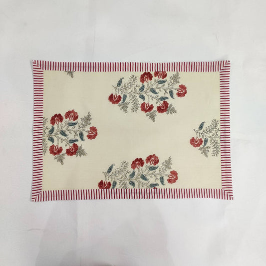 Christmas Red pink Green Flower Placemat, 'Block Print' fabric table mat easy care,machine washable rustic kitchen decor dining mat set of 2