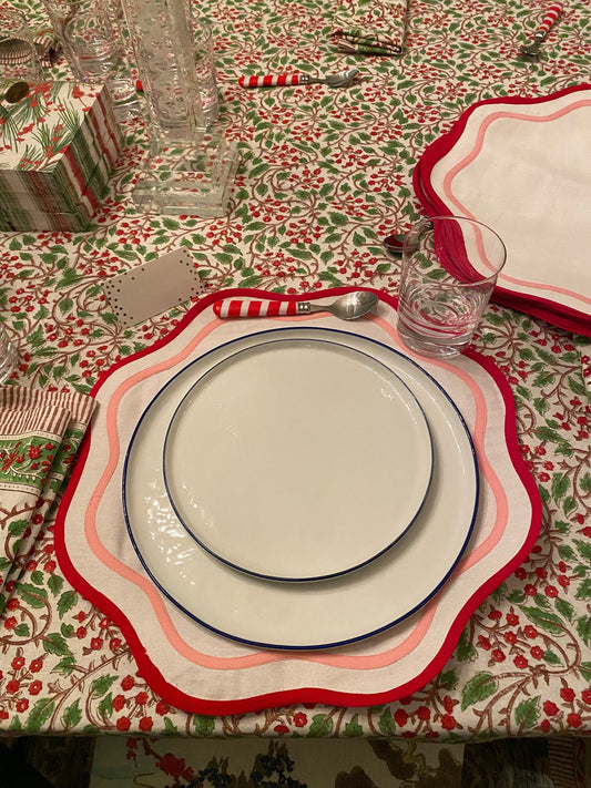 Round scalloped Christmas Placemat, Block Print fabric table mat easy care,machine washable rustic kitchen decor dining mat set of 2