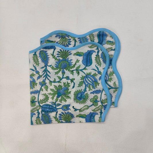 Blue Mat floral 4 Napkins and 2 Cotton Table quilted wave piped Placemats , Indian Vintage Handmade Floral Hand Block Printed Set