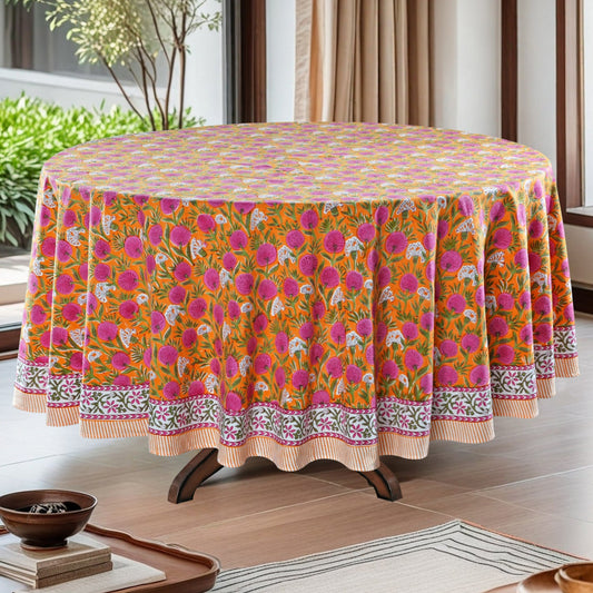 Round Tablecloth, Strawberry Pink Indian Hand Block Floral Printed Table Cover, Vintage French Tablecloth, Botanical Prints, Home and Living