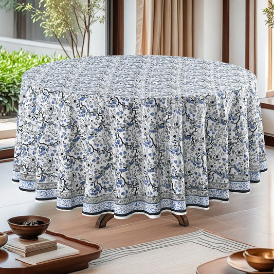 Round Tablecloth, Powder and Pigeon Blue, Green Indian Hand Block Floral Printed Table Cover, Vintage, French Tablecloth, Home and Living