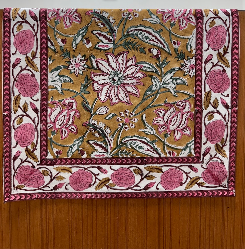A gorgeous Runner made with 100% cotton fabric is a must-have to enhance the decor and ambience of your dining table or side table. It features an elegant Indian Floral Block Print design in various colours and shades contrasting on an elegant background with an extraordinary border pattern. This 100% cotton runner is a perfect fit and essential to compliment your dining ensemble's decor.