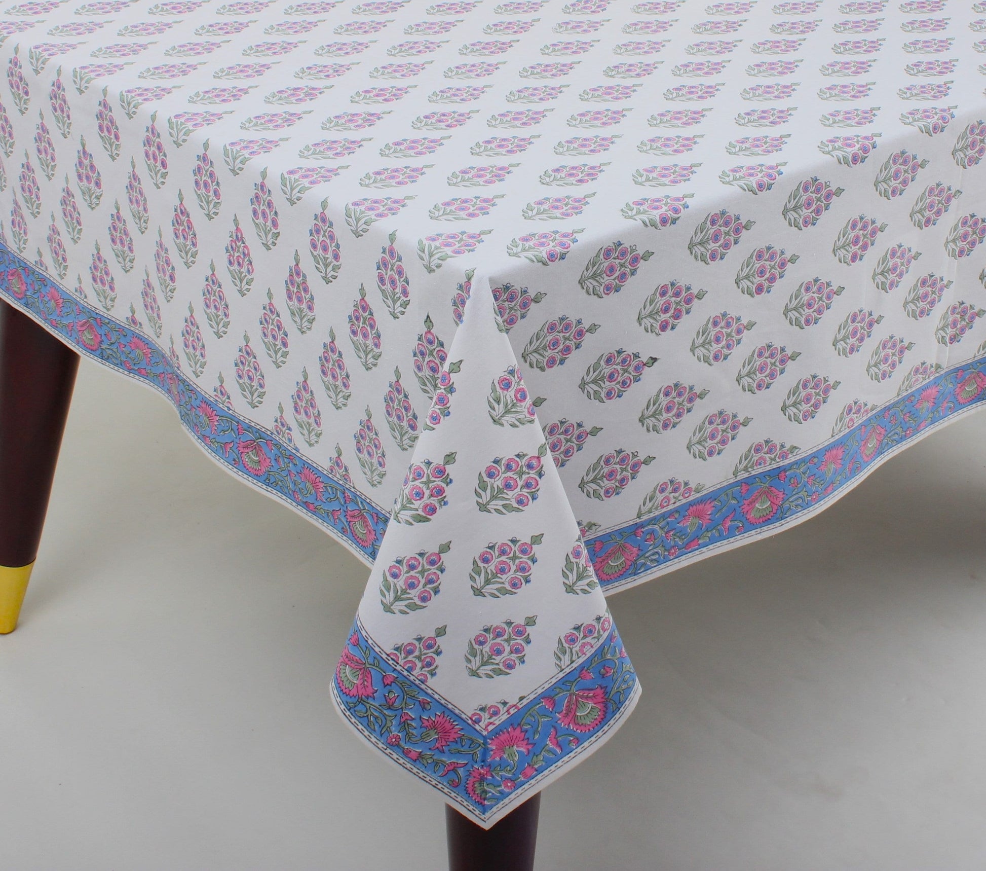 A gorgeous tablecloth made with 100% cotton fabric is a must-have to enhance the decor & ambience of your dining table or side table. It features an elegant Indian Floral hand Block Print design in various colors and shades contrasting on a nice background with a unique border pattern. This 100% cotton tablecloth is a perfect fit and necessary to compliment your dining ensemble's decor.